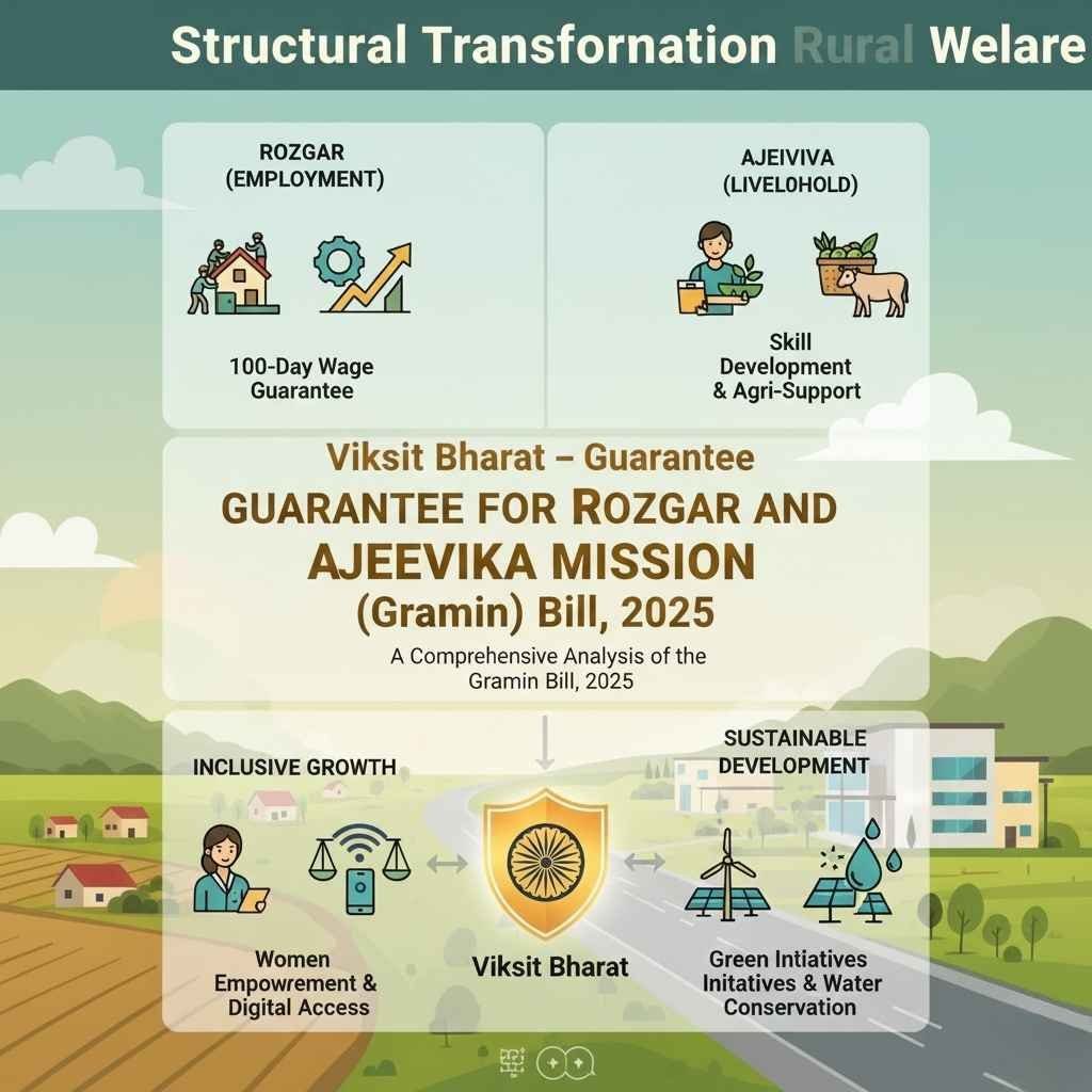 VB-G RAM G बिल का लक्ष्य इस “संकट राहत” मॉडल से “संपत्ति निर्माण” मॉडल की ओर बढ़ना है। बताया गया उद्देश्य एक आधुनिक वैधानिक ढांचा स्थापित करना है जो न केवल रोज़गार की गारंटी दे, बल्कि 2047 तक विकसित राष्ट्र बनने के राष्ट्रीय लक्ष्य के अनुरूप टिकाऊ ग्रामीण बुनियादी ढांचा भी बनाए।1 सरकार का दावा है कि यह नया ढांचा डिजिटल औपचारिकता के माध्यम से पारदर्शिता बढ़ाएगा, स्थानीय आर्थिक क्षेत्र बनाकर संकट के कारण होने वाले पलायन को कम करेगा, और जल सुरक्षा परियोजनाओं के माध्यम से कृषि उत्पादकता में सुधार करेगा।1
